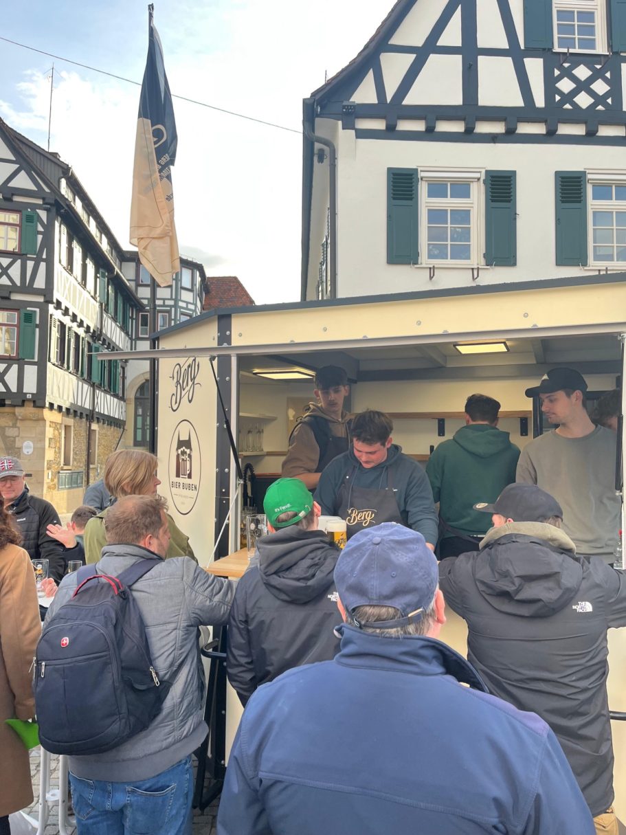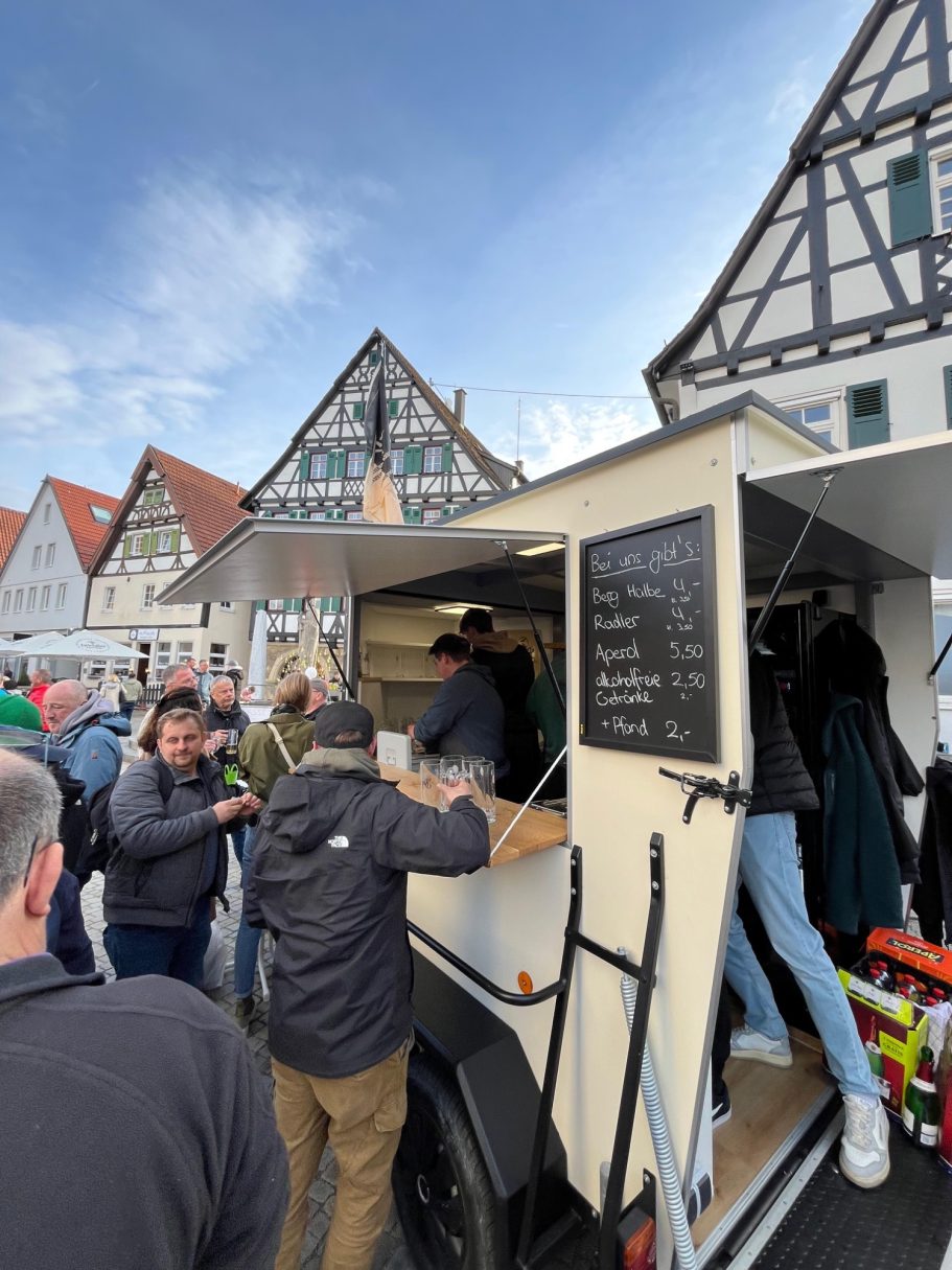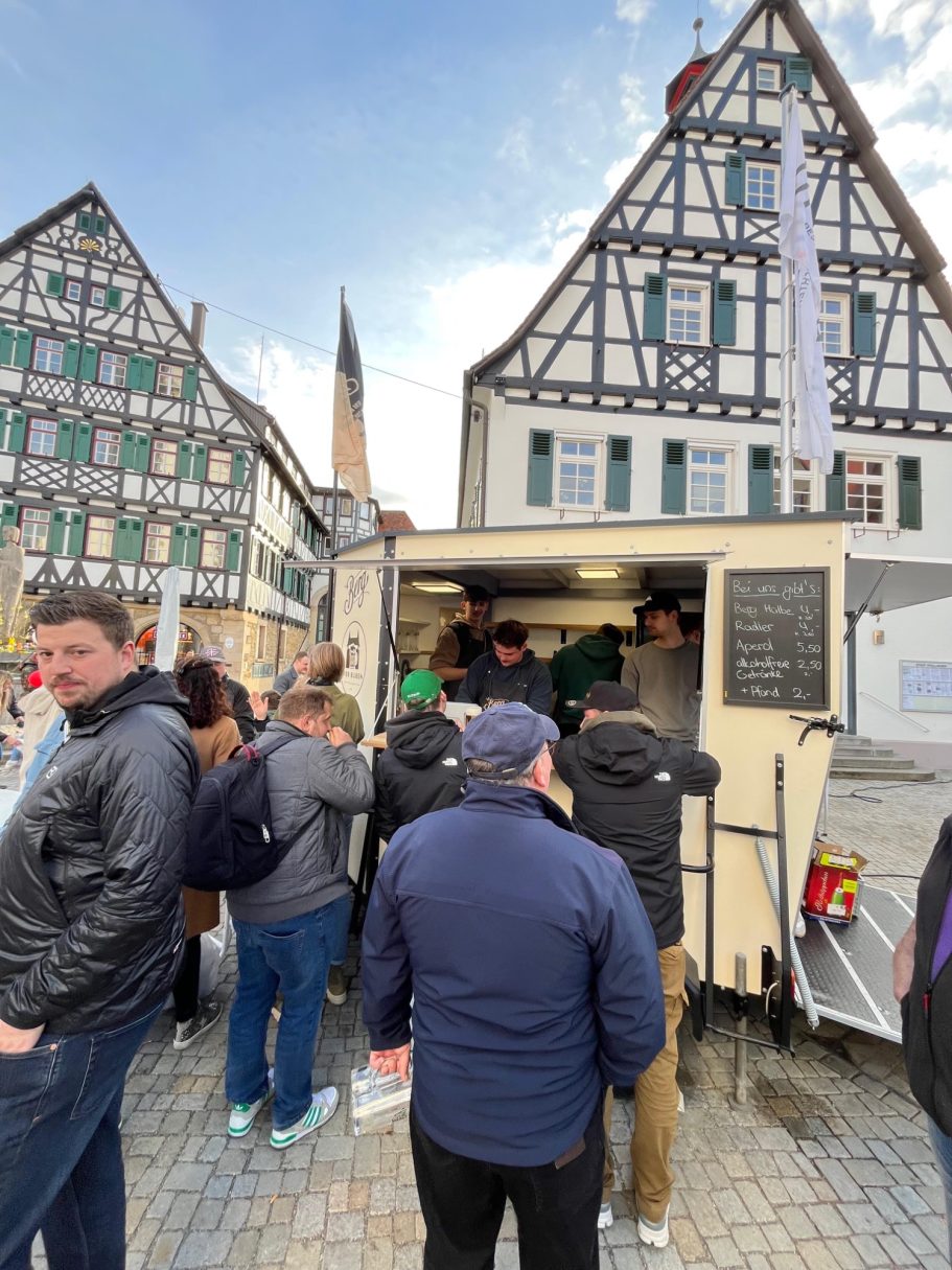 Im Mai 2025 waren wir jeden Freitag ab 17:30 Uhr mit unserem Schankwagen auf dem Pfullinger Marktplatz. Gemeinsam mit der Stadt Pfullingen möchten wir den Sommer über Leben in die Innenstadt bringen und den gastronomischen Leerstand zeitweise füllen.